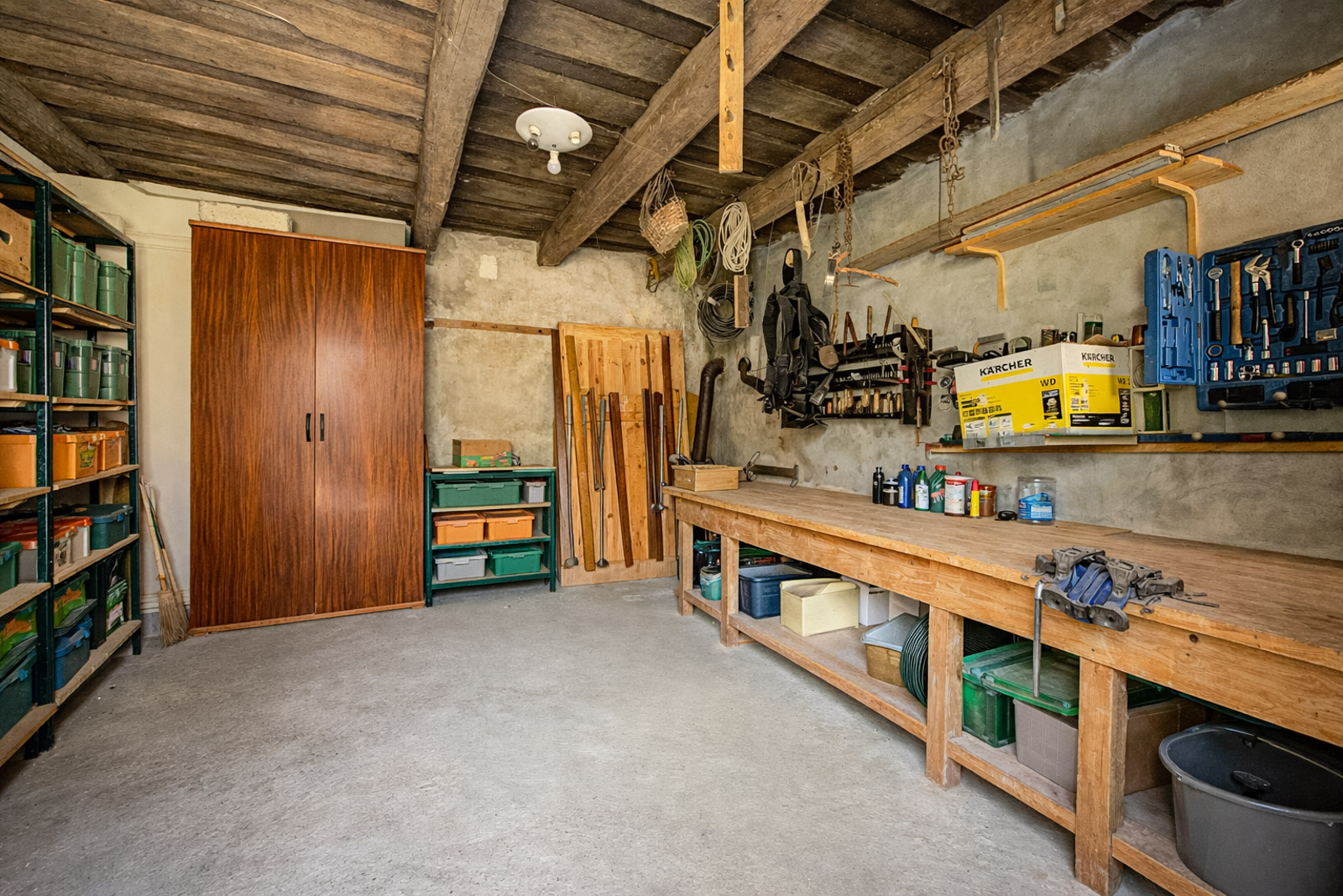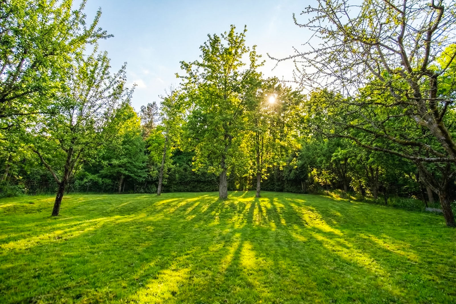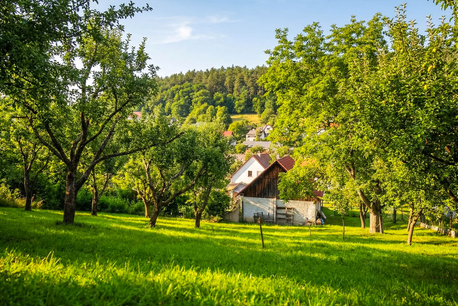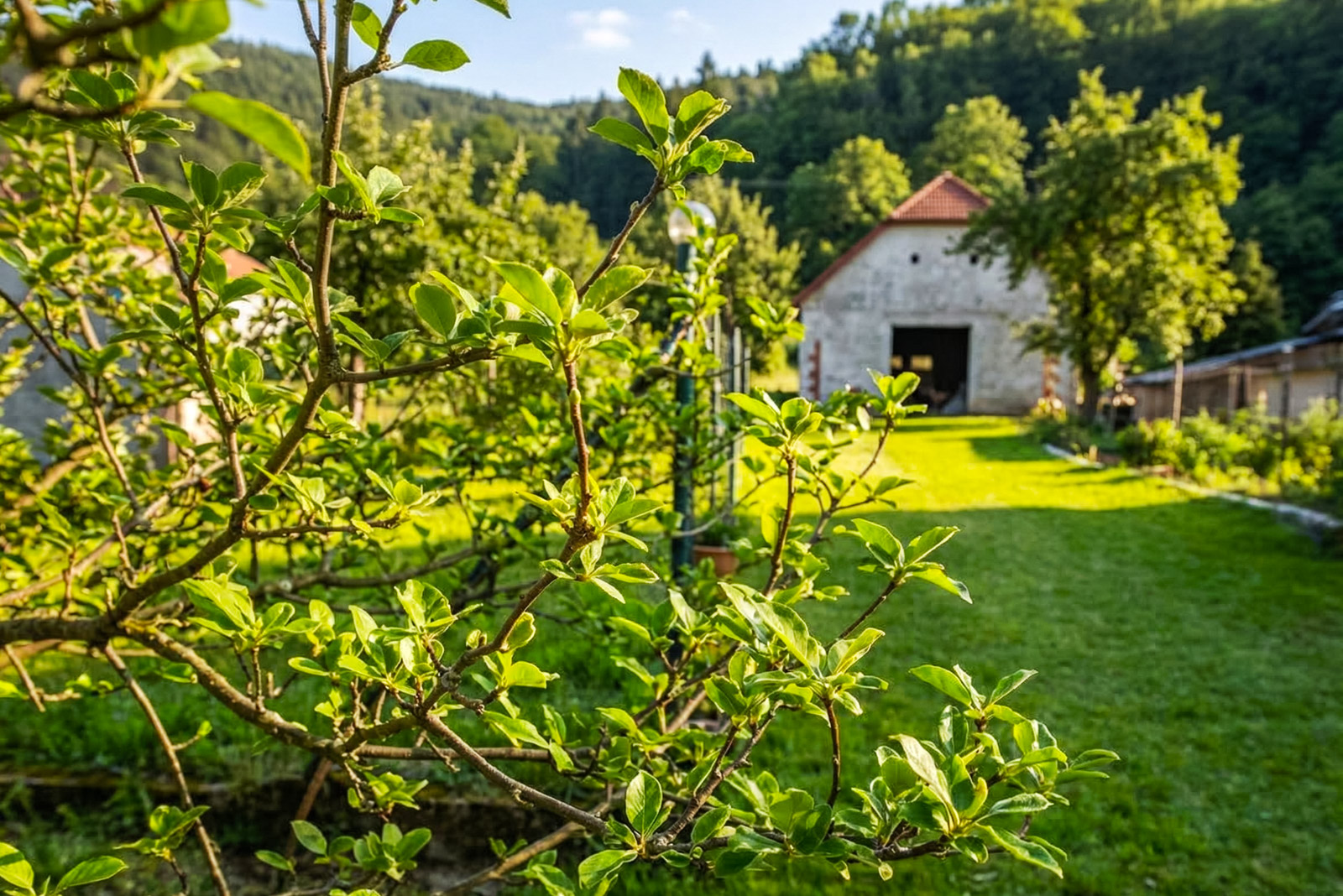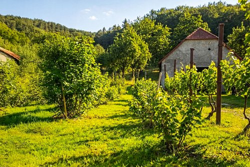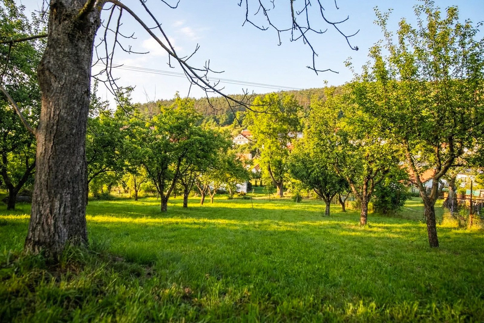 Dominantou tejto časti pozemku je veľká stodola s novou strechou, ktorá ponúka široké možnosti využitia – od dielne či skladovacích priestorov až po vytvorenie jedinečného spoločenského priestoru. Stodola spolu s oplotením prirodzene oddeľuje úžitkovú časť od zadnej časti pozemku, ktorá slúži ako ovocný sad. Aj táto časť je oplotená a vybavená viacerými vývodmi vody na pohodlné zavlažovanie počas letných dní. Pozemok sa tu mierne dvíha smerom k lesu a na jeho vrchole sa otvára príjemný výhľad na okolitú prírodu a pokojné prostredie obce.