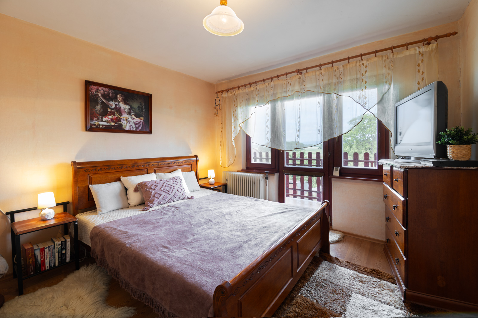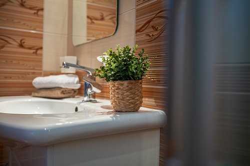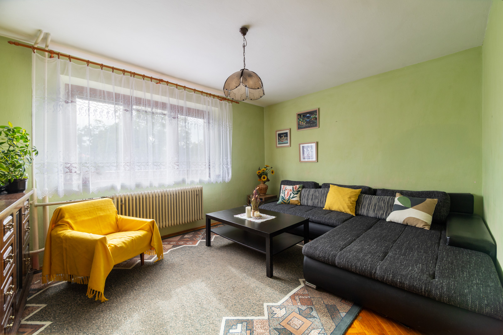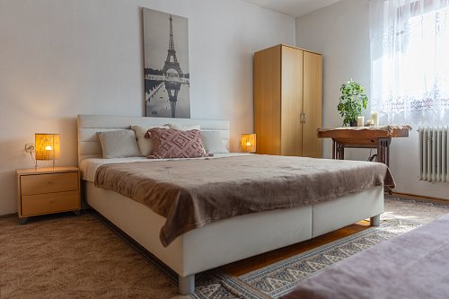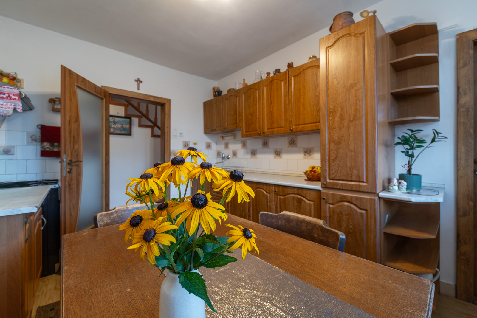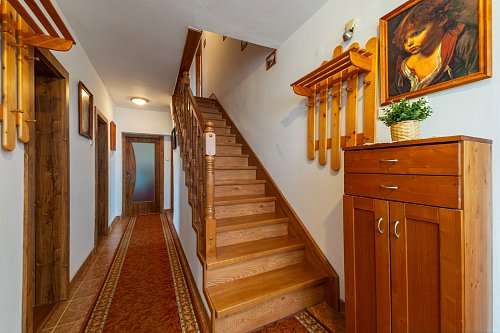 Rodinný dom sa rozprestiera na dvoch podlažiach, s podkrovím a praktickým suterénom, pričom ponúka množstvo priestoru pre pohodlné bývanie aj rôzne využitie. Hlavným vchodom vstúpite do predsiene, z ktorej vedú schody do centrálnej chodby domu. Z nej je prístup do všetkých miestností so samostatnými vchodmi. Po pravej strane od vstupu sa nachádza elegantné drevené schodisko vedúce do podkrovia. Oproti vchodu nájdete samostatnú toaletu s práčkou a hneď vedľa kúpeľňu vybavenú veľkým umývadlom, sprchovým kútom, praktickou skrinkou a rebríkovým radiátorom. Za kúpeľňou je situovaná kuchyňa so samostatnou špajzou, ideálna na uskladnenie potravín. Na konci chodby sa otvára obývačka s výhľadom do záhrady, vedľa ktorej sa nachádza spálňa orientovaná do ulice. Na opačnej strane chodby je ďalšia obývacia izba, taktiež s oknom smerujúcim na ulicu. Podkrovie ponúka dve útulné izby – jednu po pravej a druhú po ľavej strane – pričom z oboch je priamy výstup na balkón. Okrem toho sa tu nachádzajú aj dva praktické podkrovné úložné priestory, ktoré aktuálne slúžia ako šatníky. Suterén je prístupný buď priamo z chodby na prízemí, alebo samostatným vchodom zo záhrady. Nachádza sa tu kuchyňa so sporákom, ideálna napríklad na sezónne zaváranie, a krbové kachle s komínom prechádzajúcim cez vrchnú obývaciu izbu, s možnosťou vybudovania krbu. Súčasťou suterénu sú aj ďalšie miestnosti – dielňa a garáž. Exteriér ponúka prístrešok na auto, altánok za domom a kompletne oplotený dvor. Za dvorom sa rozprestiera priestranná záhrada plná ovocných stromov – jabloní, višní, čerešní a hrušiek – ktorá poskytuje nielen úrodu, ale aj priestor na oddych a relax. Nehnuteľnosť je orientovaná na východ a západ, čo zabezpečuje dostatok denného svetla počas celého dňa.