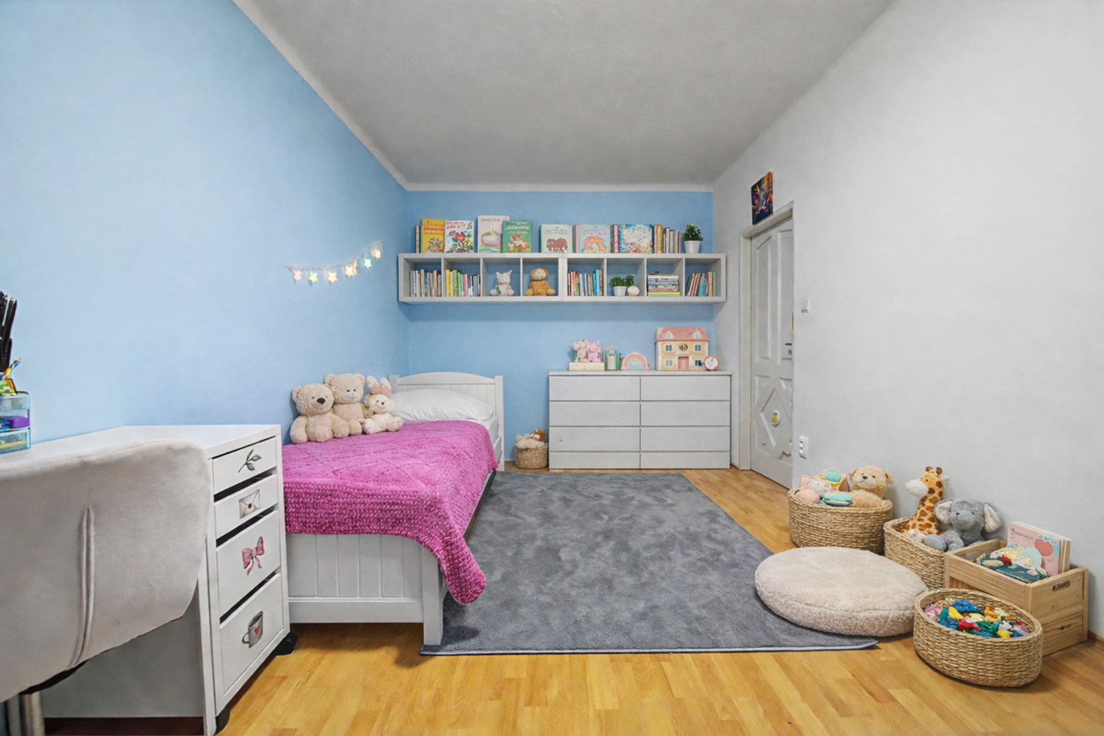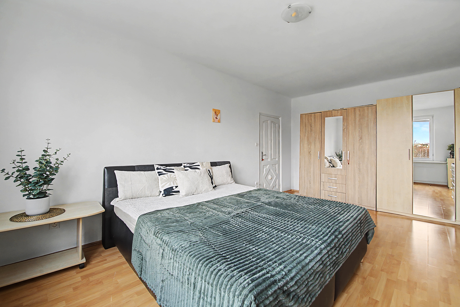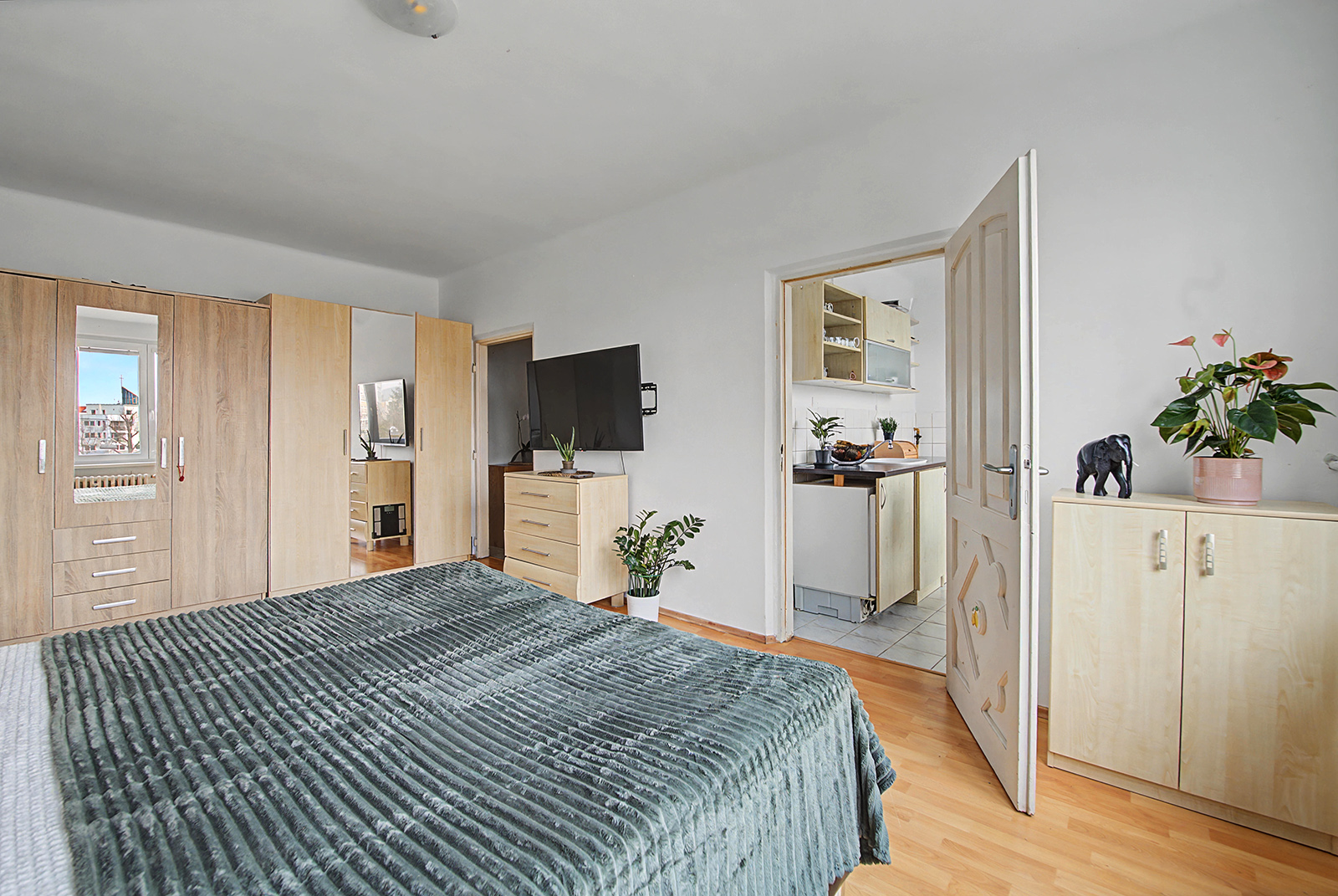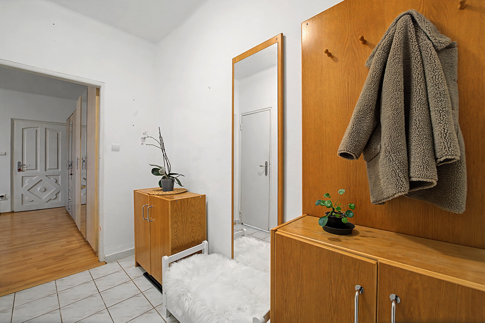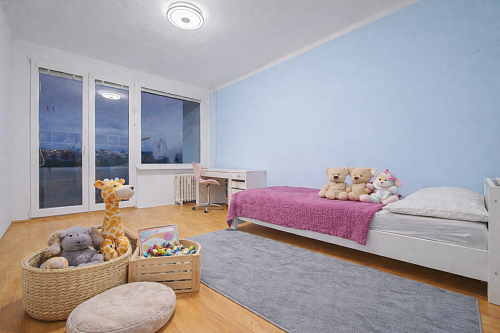 Byt ponúka dve plnohodnotné obytné miestnosti – obývačku zariadenú samostatne stojacimi skriňami a komodami a spálňu (resp. detskú izbu), ktoré poskytujú dostatok priestoru na pohodlné bývanie.