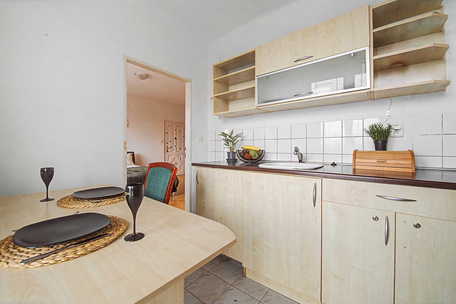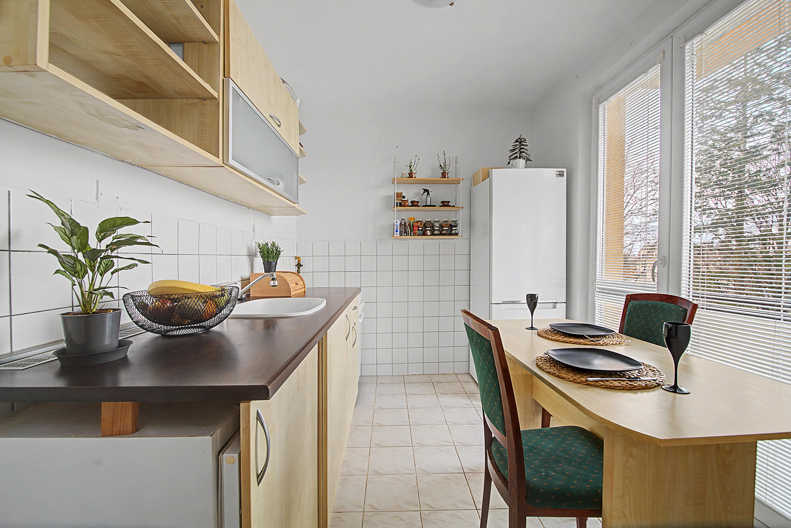 Samostatná kuchyňa je vybavená kuchynskou linkou, menšou zabudovanou chladničkou, elektrickou rúrou s plynovým varičom a jedálenským stolom so stoličkami, čo vytvára príjemný priestor na každodenné stolovanie.