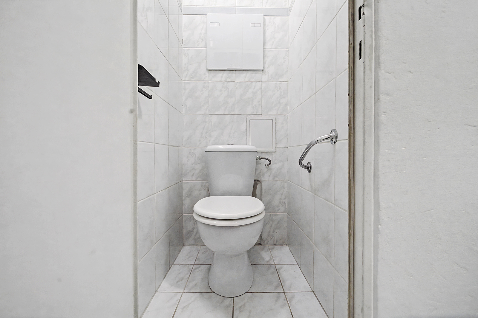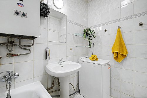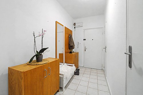 Byt sa nachádza na 4. poschodí z 5 v bytovom dome s výťahom. Do bytu vstupujete cez vstupnú chodbu, z ktorej je prístup do všetkých miestností. Hneď pri vstupe sa nachádza samostatná toaleta a kúpeľňa vybavená vaňou, umývadlom a práčkou.