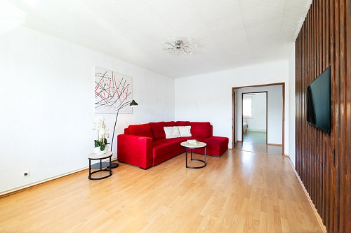 Byt sa skladá z priestrannej chodby, z ktorej sa vstupuje do všetkých miestností. Po pravej strane od vchodu sa nachádza detská izba, vedľa nej je spálňa orientovaná na sever. Priamo z chodby sa vstupuje do priestrannej obývačky s východom na balkón, ktorá je spolu s kuchyňou orientovaná na juh. Po ľavej strane od hlavného vchodu nájdete kúpeľňu a samostatnú toaletu, za ktorými sa nachádza kuchyňa. K bytu prináleží pivnica umiestnená v suteréne bytového domu, priestranná špajza priamo v byte, garáž pre jedno vozidlo situovaná pred vchodom do budovy a ďalšie vonkajšie parkovacie státie.