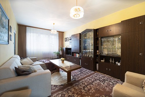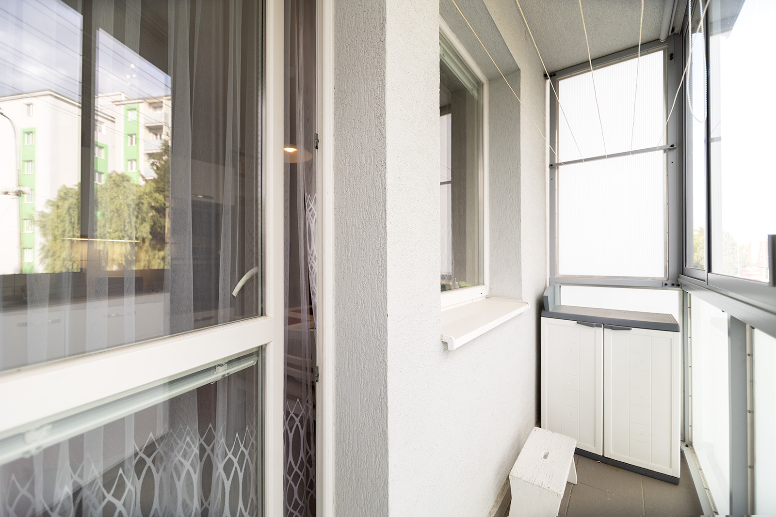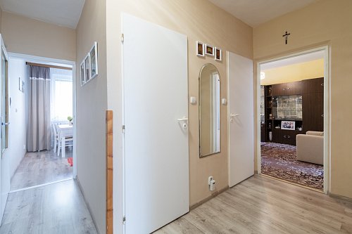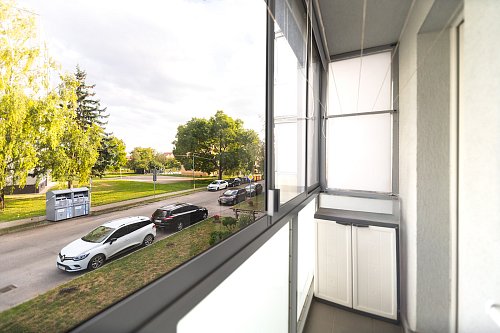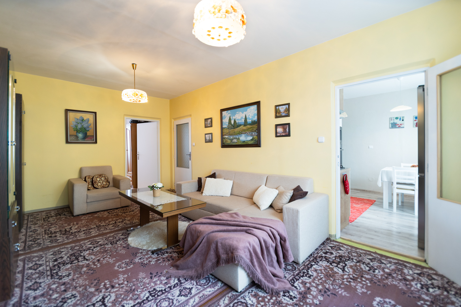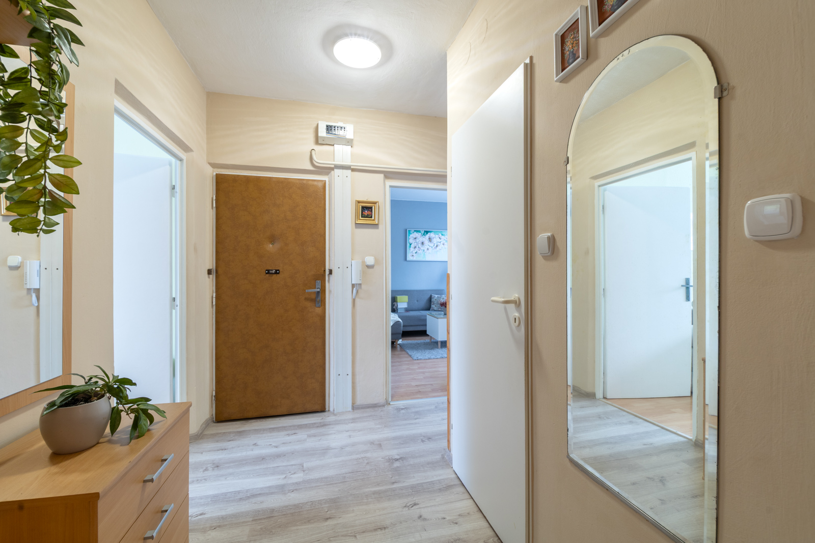 Byt sa nachádza na prvom nadzemnom podlaží a ponúka premyslené riešenie priestoru s centrálnou chodbou prechádzajúcou stredom bytu. Pri vstupe do bytu sa dostanete do hlavnej chodby. Po pravej strane nájdete detskú izbu, oproti sa nachádza samostatná toaleta a samostatná kúpeľňa. Priamo z chodby sa vstupuje do obývačky s juho-západnou orientáciou, z ktorej máte prístup do spálne po pravej strane. Po ľavej strane od hlavného vchodu sa nachádza ďalšia detská izba s výstupom na balkón a vedľa nej kuchyňa, ktorá má takisto vlastný balkón. Z kuchyne je možný priamy vstup aj do obývačky, čo vytvára príjemné prepojenie priestorov. V suteréne bytu sa nachádza pivnica a spoločné priestory bicyklárne. Vonkajšie parkovanie je verejné, kde však nie je problém nájsť voľné parkovacie miesto.
