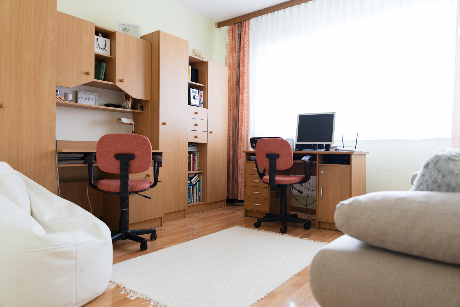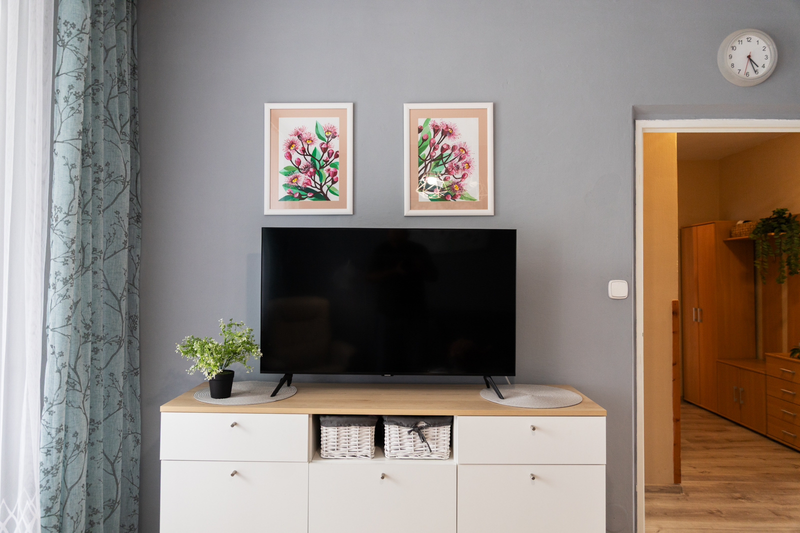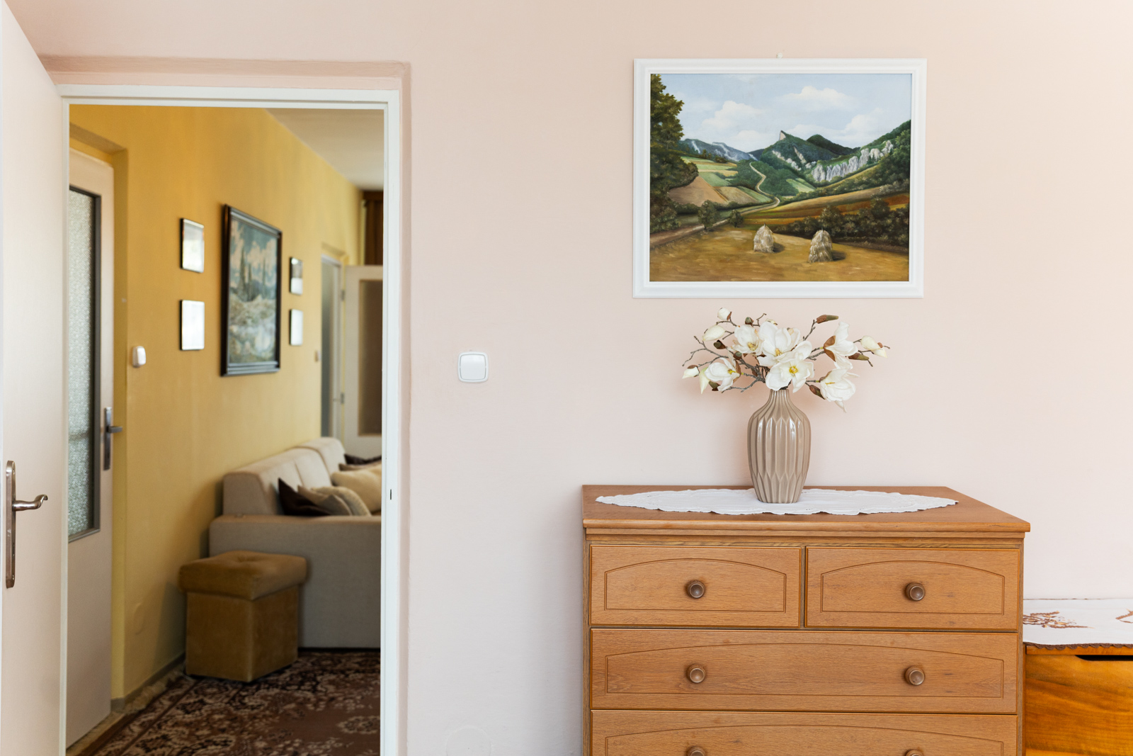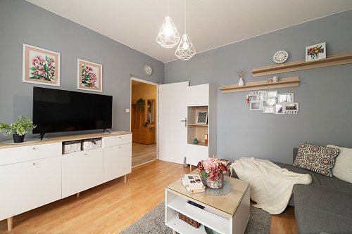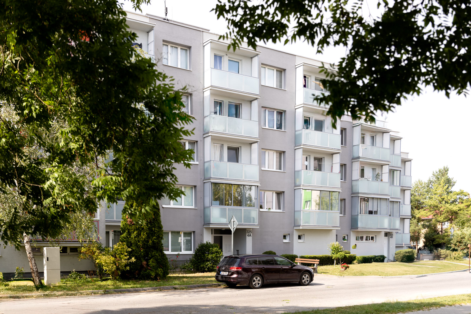 Byt sa nachádza na prvom nadzemnom podlaží a ponúka premyslené riešenie priestoru s centrálnou chodbou prechádzajúcou stredom bytu. Pri vstupe do bytu sa dostanete do hlavnej chodby. Po pravej strane nájdete detskú izbu, oproti sa nachádza samostatná toaleta a samostatná kúpeľňa. Priamo z chodby sa vstupuje do obývačky s juho-západnou orientáciou, z ktorej máte prístup do spálne po pravej strane. Po ľavej strane od hlavného vchodu sa nachádza ďalšia detská izba s výstupom na balkón a vedľa nej kuchyňa, ktorá má takisto vlastný balkón. Z kuchyne je možný priamy vstup aj do obývačky, čo vytvára príjemné prepojenie priestorov. V suteréne bytu sa nachádza pivnica a spoločné priestory bicyklárne. Vonkajšie parkovanie je verejné, kde však nie je problém nájsť voľné parkovacie miesto.