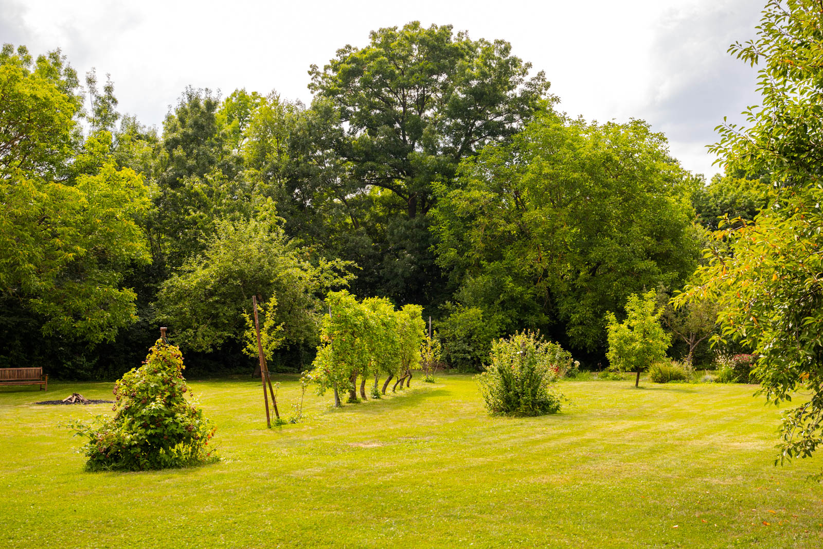 Záhradu obklopuje množstvo ovocných stromov a kríkov – jablone, hrušky, maliny, černice, mirabelky aj vinič pozdĺž plota, čo ocení každý, kto túži po vlastnej úrode. V zadnej časti pozemku sa nachádza briežok s potôčikom a za ním ďalšia časť pozemku ukončená potokom Dubová, čo dotvára výnimočne pokojnú a prírodnú atmosféru. Na pozemku je tiež samostatne stojaca garáž a ďalej od domu sa nachádza menší hospodársky domček, ktorý je možné využiť na uskladnenie náradia, dreva alebo ho adaptovať podľa potrieb nových majiteľov.