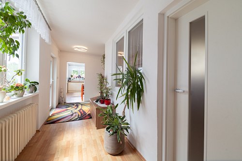 Dom sa nachádza na jednom podlaží so vstupom z dvora cez zastrešenú terasu. Pri vstupe sa dostávate do centrálne umiestnenej presklenenej chodby, ktorá poskytuje krásny výhľad do dvora a na terasu vďaka oknám pozdĺž celej dĺžky domu. Z ľavej strany chodby sa vstupuje do prakticky riešenej kuchyne, ktorá má priamy prístup do špajze a technickej miestnosti. Tiež sa tu nachádza kúpeľňa a samostatné WC. Pravá strana domu ponúka flexibilné riešenie bývania s prístupom do samostatnej izby s vlastnou toaletou a umývadlom. Ďalej sa tu nachádzajú dve menšie miestnosti, ktoré sú v súčasnosti využívané ako kancelárie, ale možno ich ľahko premeniť na detské izby podľa potrieb rodiny. Dominantou domu je priestranná obývačka, ktorá vytvára centrálne miesto pre relaxáciu a spoločenské aktivity. Vedľa obývačky sa nachádza ďalšia izba s priamym prístupom z chodby, ktorá je prechodová do druhej spálne.