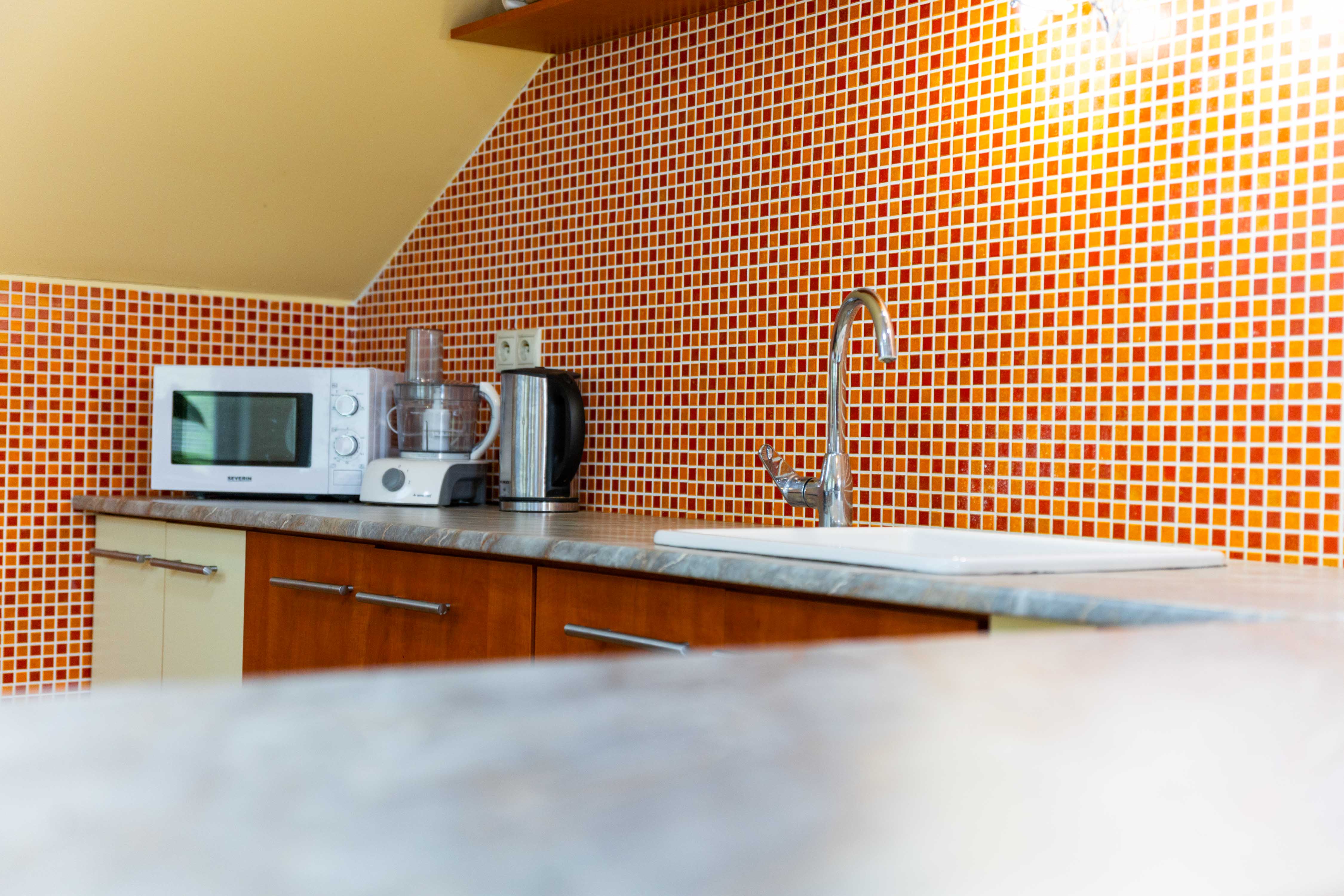 Gastro-prevádzka zahŕňa recepciu, profesionálne vybavenú kuchyňu, kanceláriu, skladové priestory, toalety a výstup na krytú terasu s možnosťou sedenia.