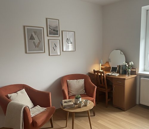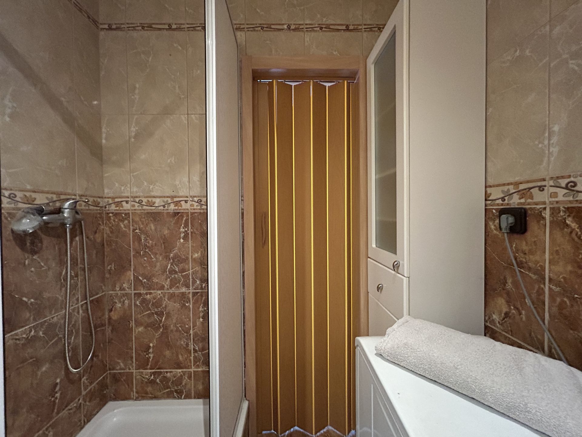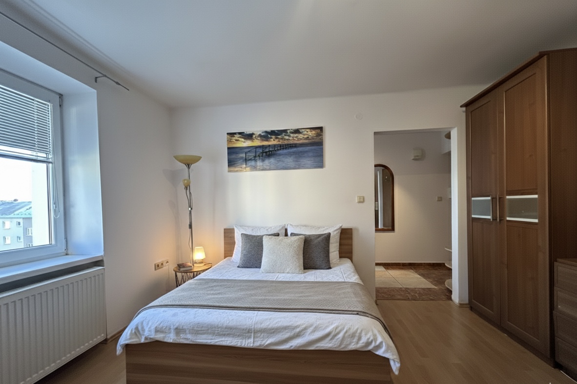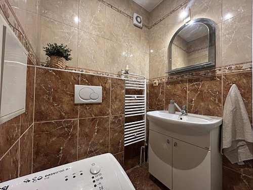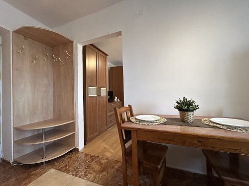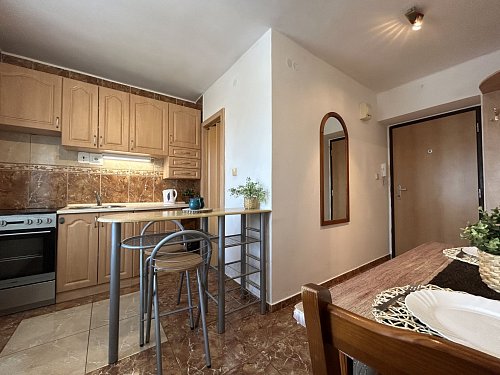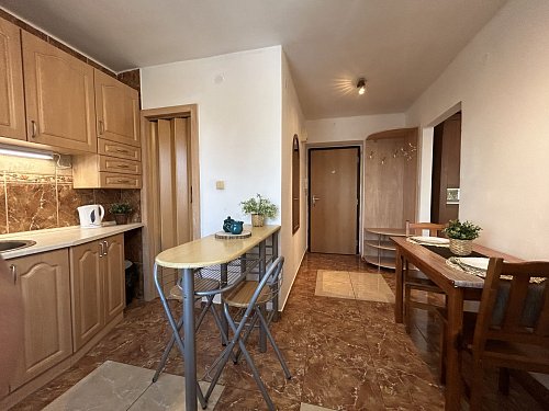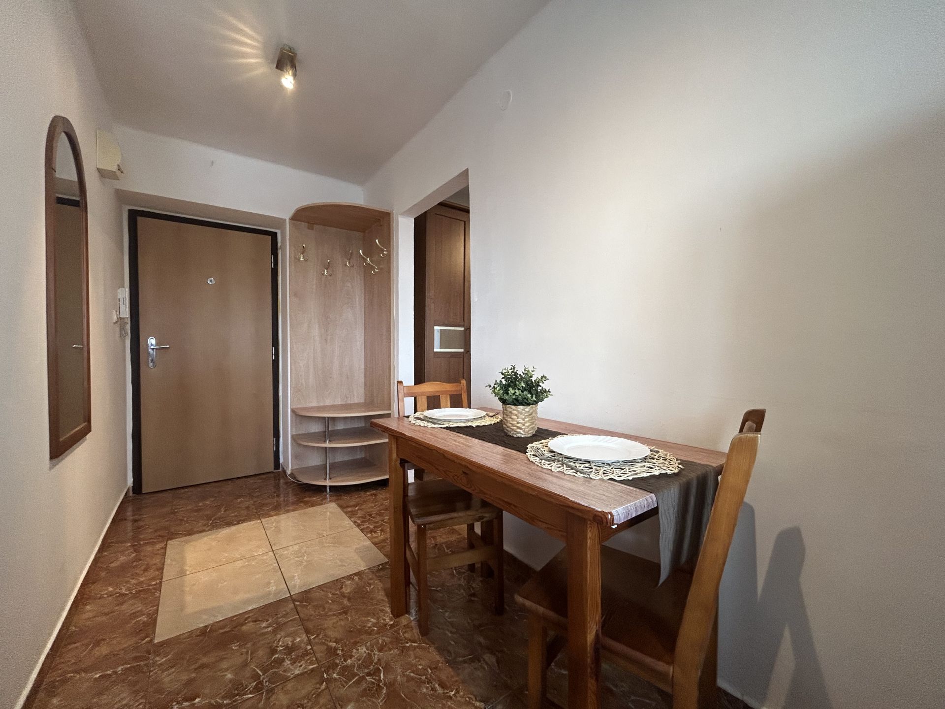 Úžitková plocha bytu je 32 m², pričom k bytu prislúcha aj pivničný priestor s rozlohou 2 m². Pri vstupe do bytu vás privíta praktický rohový odkladací priestor, ktorý je ideálny na topánky a bundy. Oproti vstupu sa nachádza jedálenský kút so stolom a stoličkami, ktorý je spojený s kuchynskou linka vybavenou elektrickou varnou doskou, elektrickou rúrou a chladničkou. Priestor je predelený barovým pultíkom s dvoma stoličkami poskytujúci príjemné miesto na rýchle raňajky alebo večerné posedenie. Základný riad je súčasťou kuchyne. Kúpeľňa je riešená prakticky a obsahuje sprchový kút, toaletu, umývadlo a práčku, čo zaručuje maximálny komfort a pohodlie. Nechýba ani úložný priestor v podobe vysokej skrinky, kde si môžete odložiť všetky potrebné veci. Obývacia izba, ktorá sa nachádza naľavo od vstupných dverí, je zariadená tak, aby poskytovala útulné a príjemné prostredie na relaxáciu a oddych. Nájdete tu posteľ, skrine, komodu s televízorom, pohodlné kreslá a konferenčný stolík, ako aj kozmetický stôl, ktorý oceníte pri každodennej rutine.